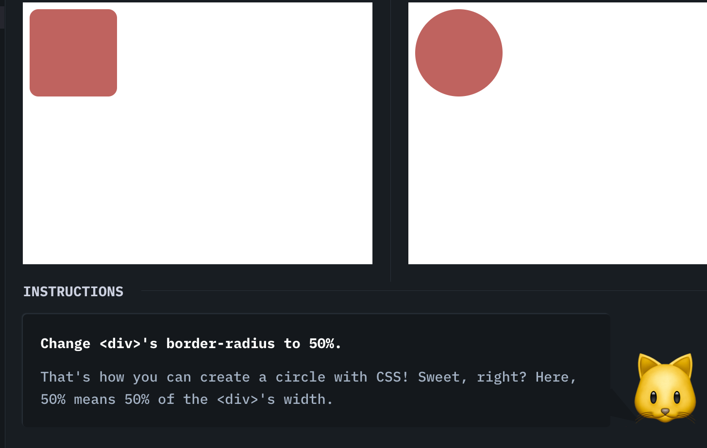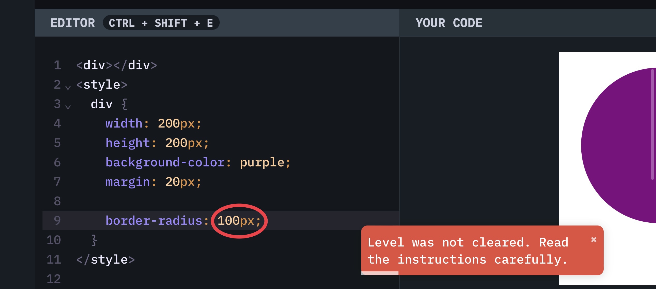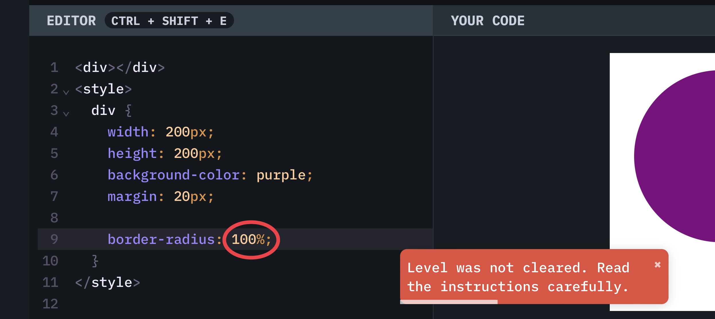 I've been trying to complete level #23 of CSSBattle's LEARN but unfortunately the webpage doesn't let me continue after inputting what I believe is the right value (100px) in order to create a circle.