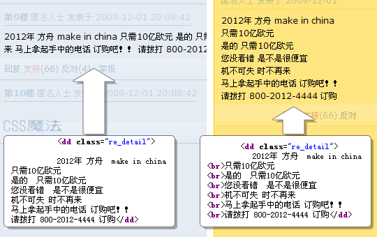 (下图为 cnBeta 网站对评论文本的两种不同处理方式:左侧为普通评论,可能为了限制各条评论的高度、防止恶意刷屏,系统未做换行符转换处理;右侧为热门评论,系统进行了处理。)