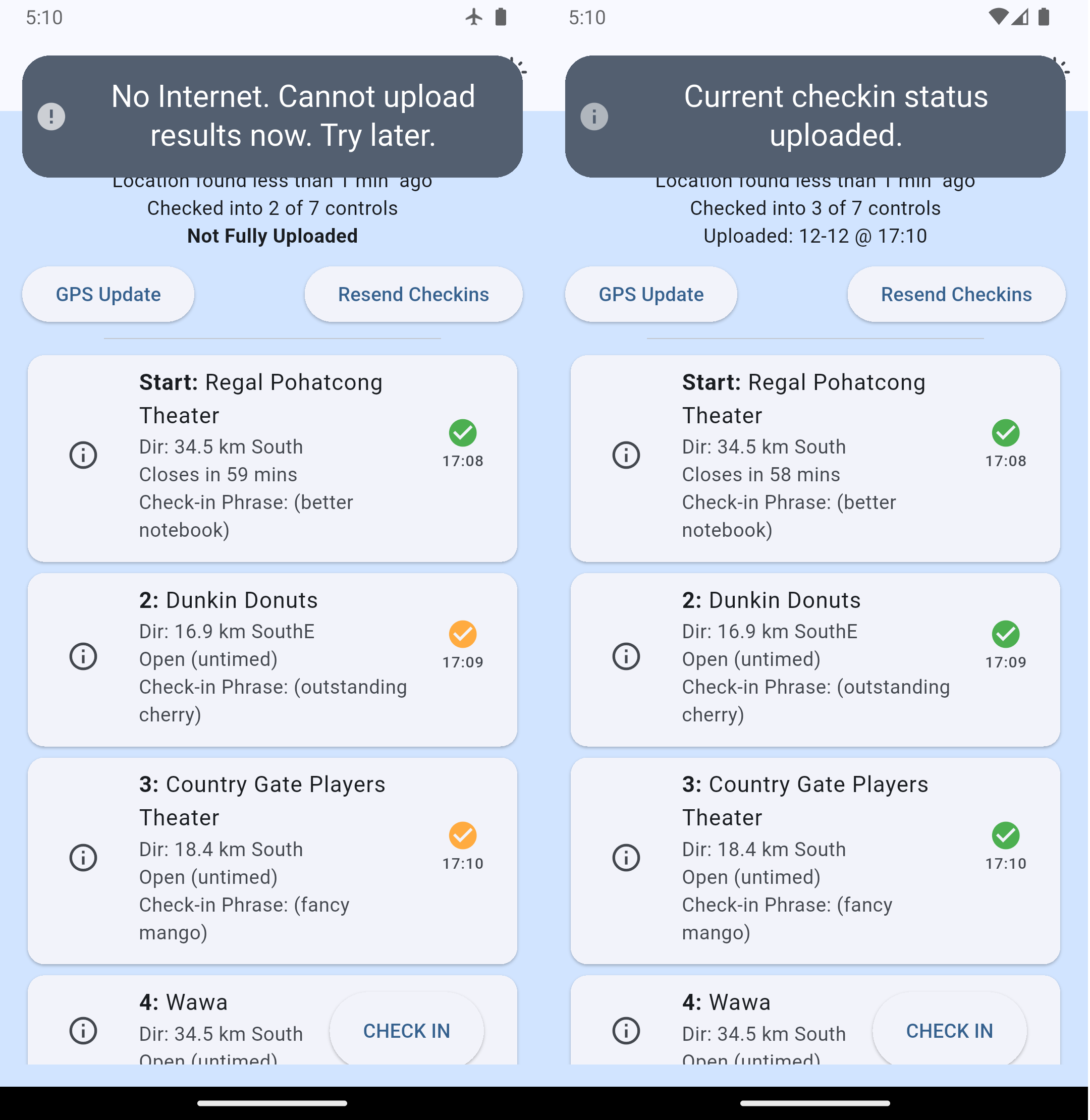 IMPORTANT: Orange checkmarks are still good, but if possible it's a little better if all your controls show green checks at the end of the event. It helps the RBA/organizer to have your complete set of checkins and finish time uploaded. This reduces work and possible error. To turn your checks green, use the "Resend Check-Ins" button to have all your checkins are uploaded to the web and turn your checks green. Of course, be sure to find working Internet service before pressing "Resend Check-Ins"!