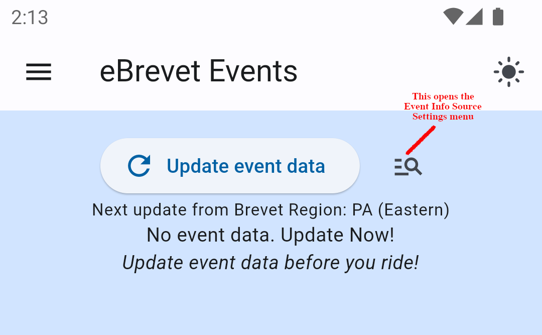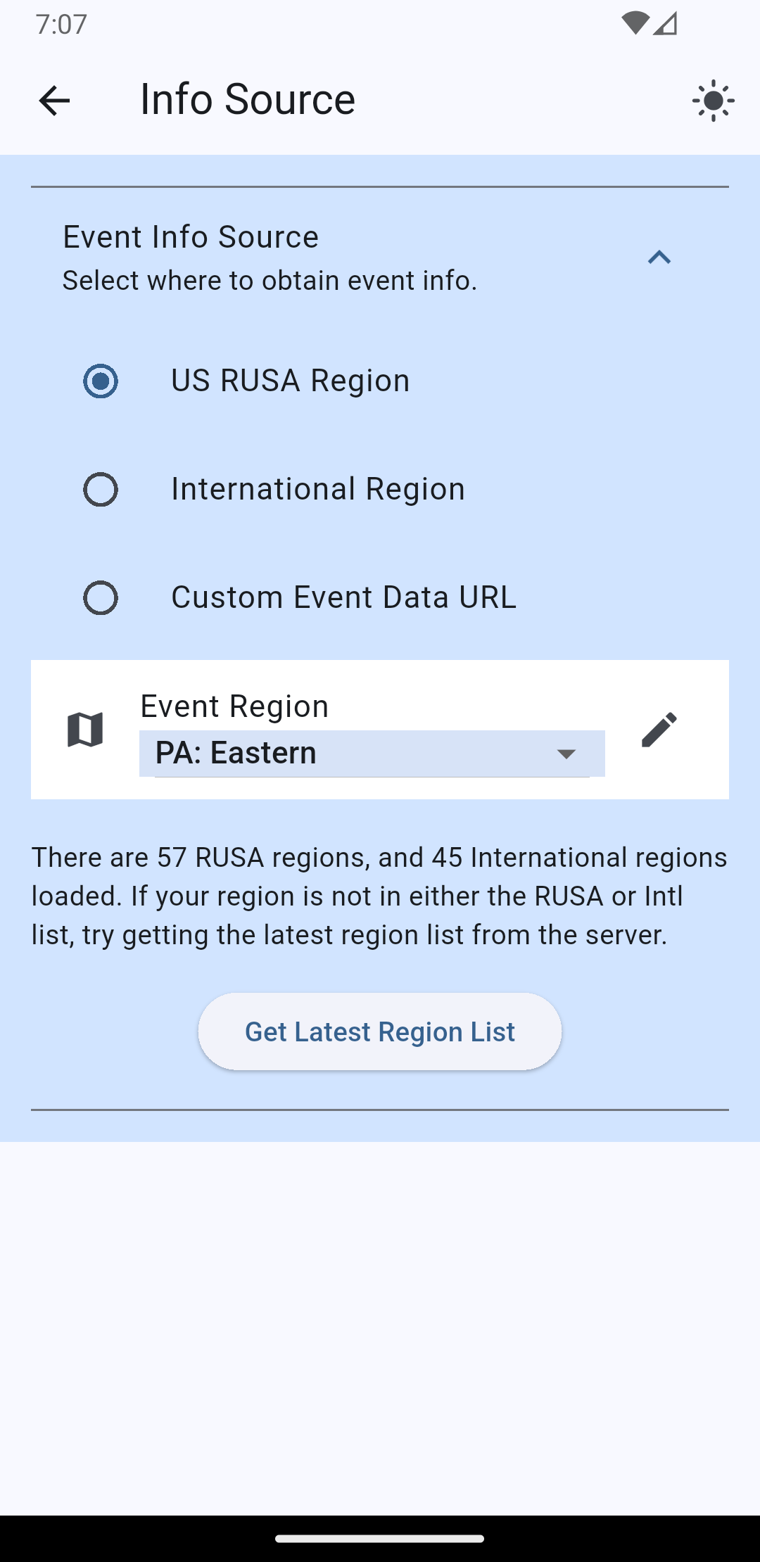The app allows you to select from a list of regions in the US, from international regions, or to specify a custom URL from which to fetch event data. The default is PA: Eastern. Please only select regions that support eBrevet. If a region does not support eBrevet, you will not be able to use eBrevet for those events. Talk to your RBA and RUSA about supporting eBrevet for the events you want to ride. More supported regions are being added all the time.