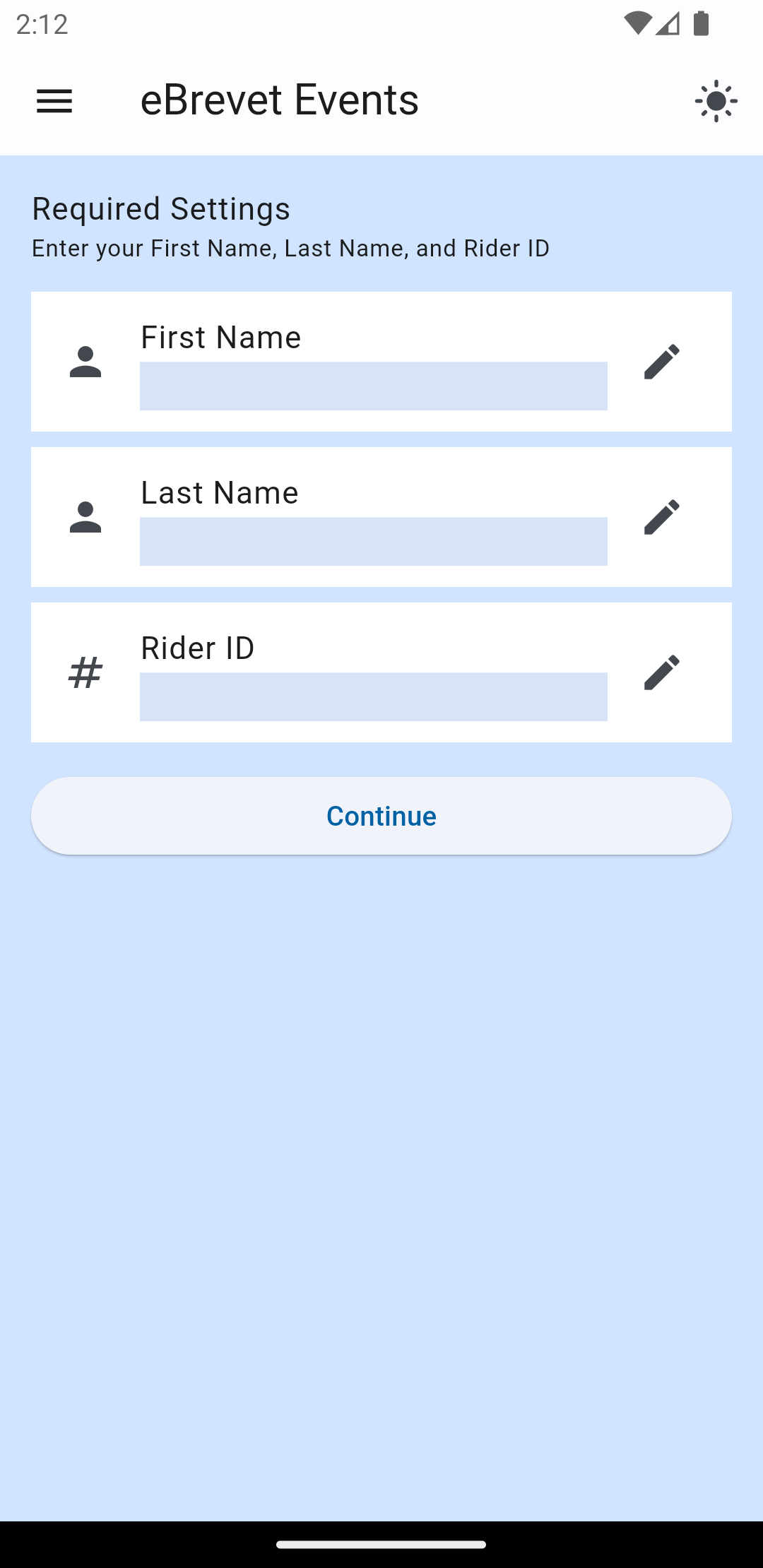 Once you've set your name and rider ID number, press "Continue". This will take you to the main eBrevet Events screen.
