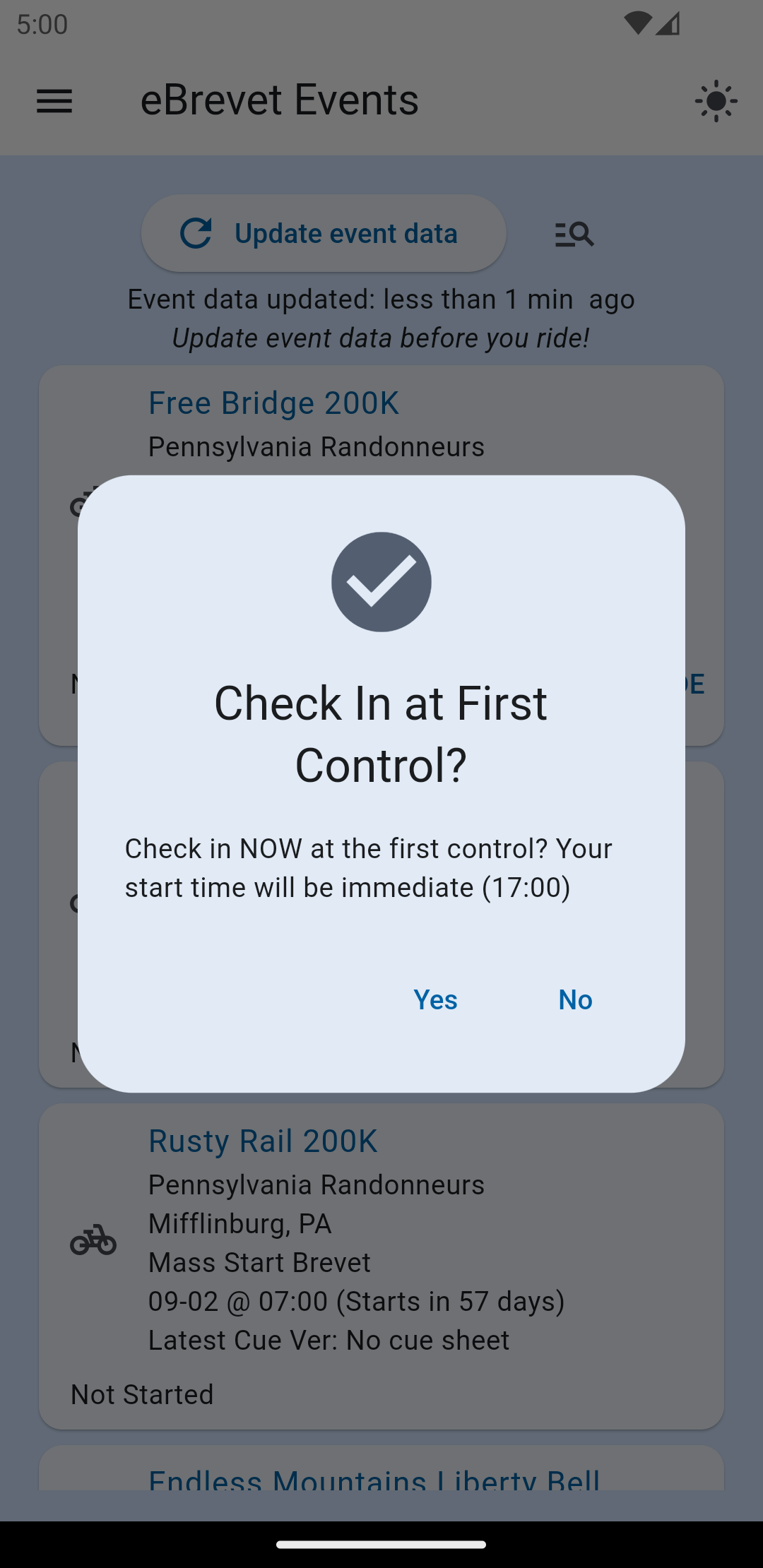 IMPORTANT: If your Club/Region changes the cues for an event (control location, start time, route, etc...), you will need to press "Refresh Events" again when you have Internet access. If you don't do this, the event data on your phone may be invalid and you won't be able to ride.