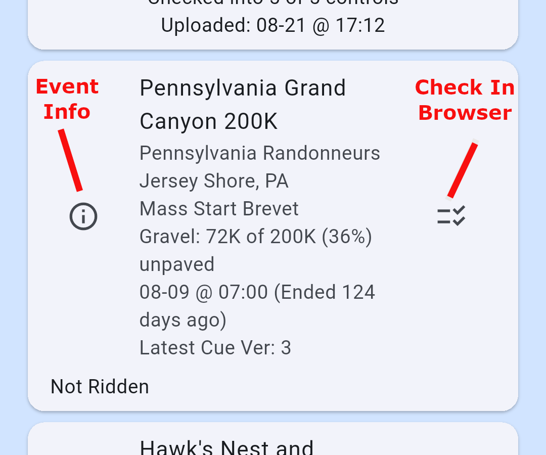 If for some reason uploads fail and you don't have green checks on all your controls when you've finished an event, now it's really a good idea to write those check-in codes onto your paper brevet card. There will also be an event Finish Code that certifies you checked into all the controls at the proper times and in the right order!