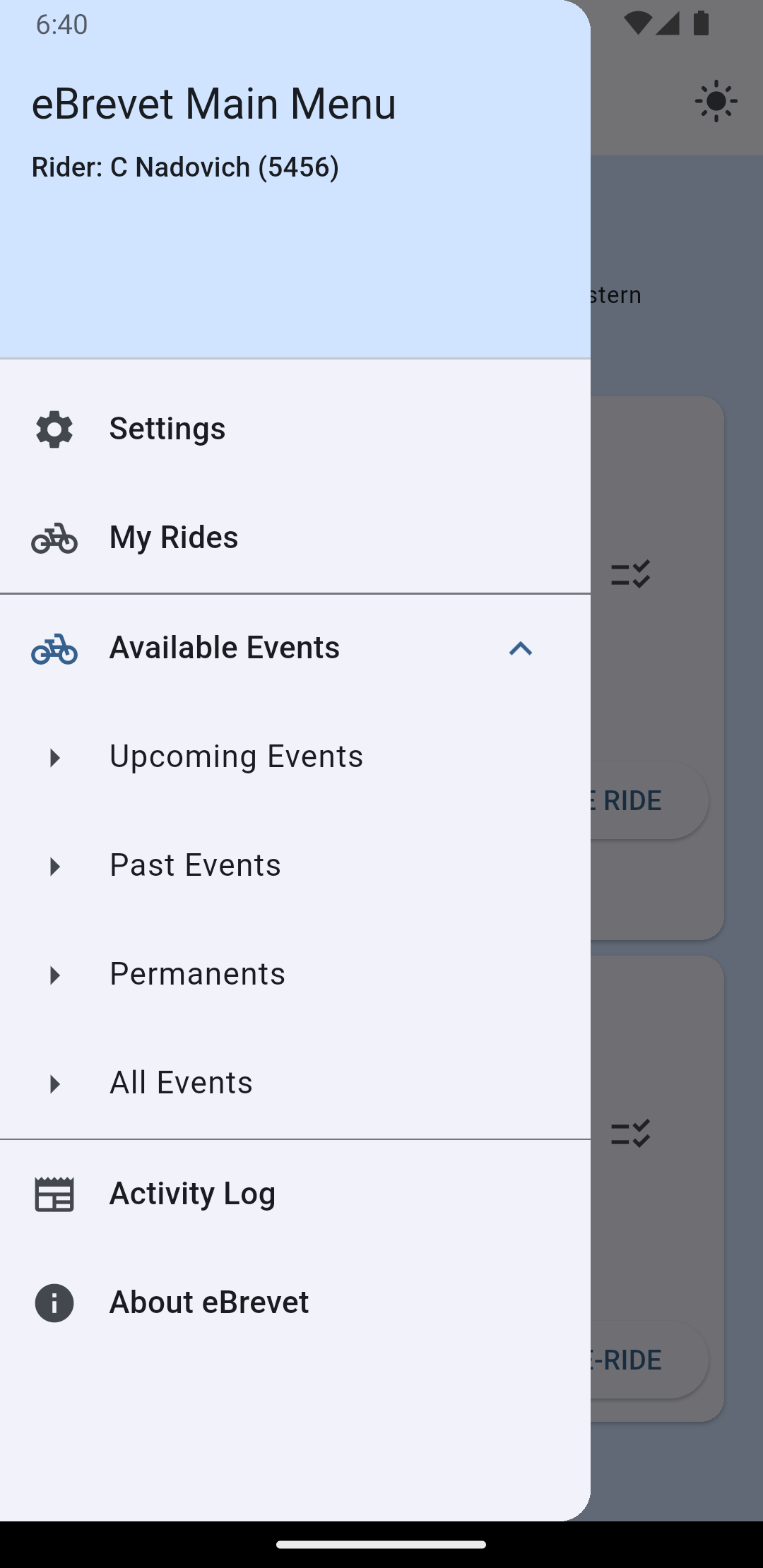 On the main eBrevet page you will see three horizontal lines in the upper left corner (the so called hamburger icon). Clicking this will open the side drawer menu. This menu allows you to access app settings (eg Rider Name, Rider ID, select the Event Info Source (ie brevet region) and all the events published by that region. You can also see Rides you have completed, a log of app activity, and the About eBrevet dialog.