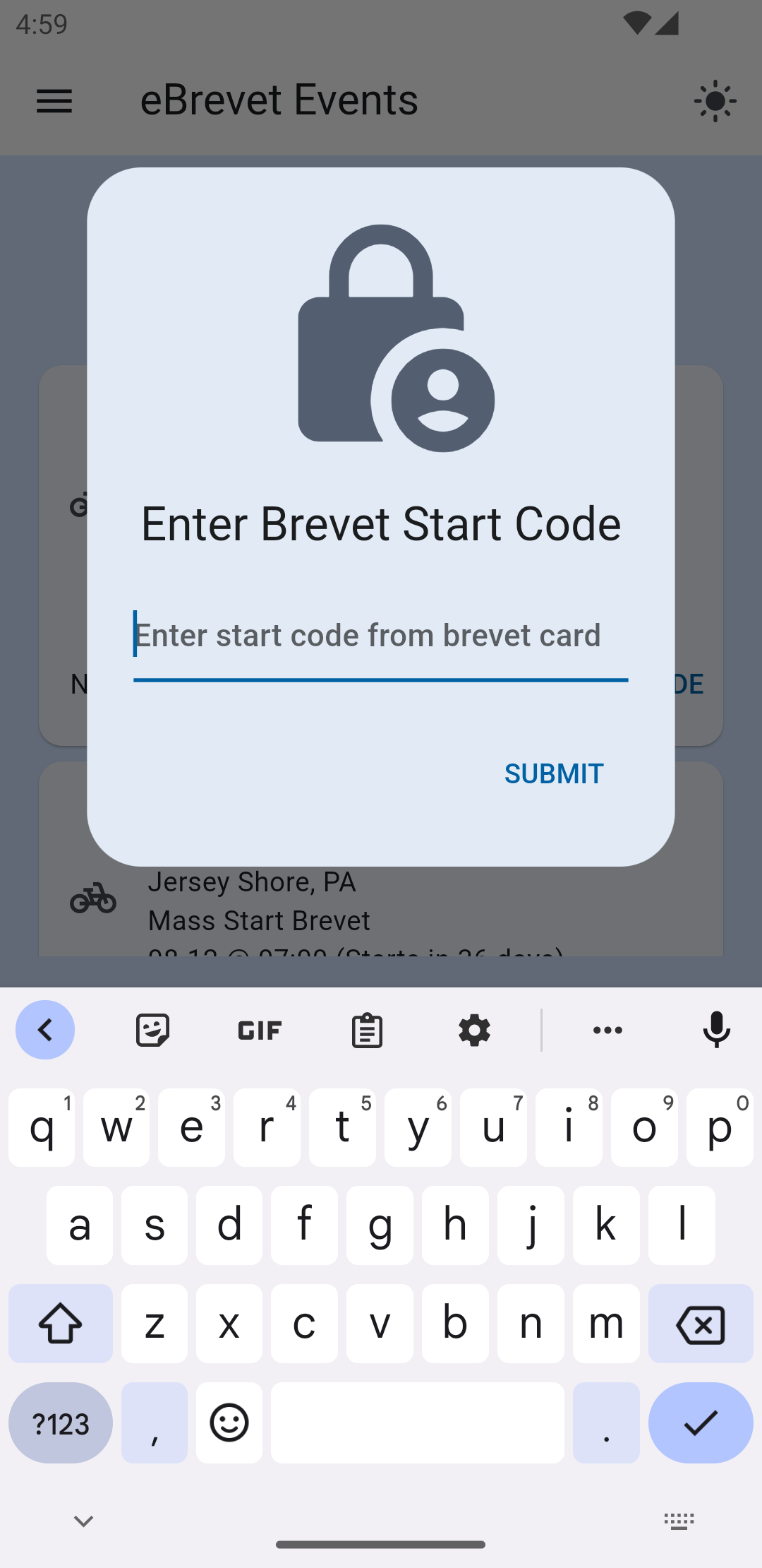 The first time you choose RIDE/PRERIDE, you will need to enter your Start Code to start the event. The start code is a four character code printed on your brevet card, or available from the event organizer. Every rider has a different start code. If your Start Code isn't working, make sure you have the latest version of the events refreshed from the Server, and that you have the latest version of the eBrevet app. Also be sure you entered your Rider ID correctly.