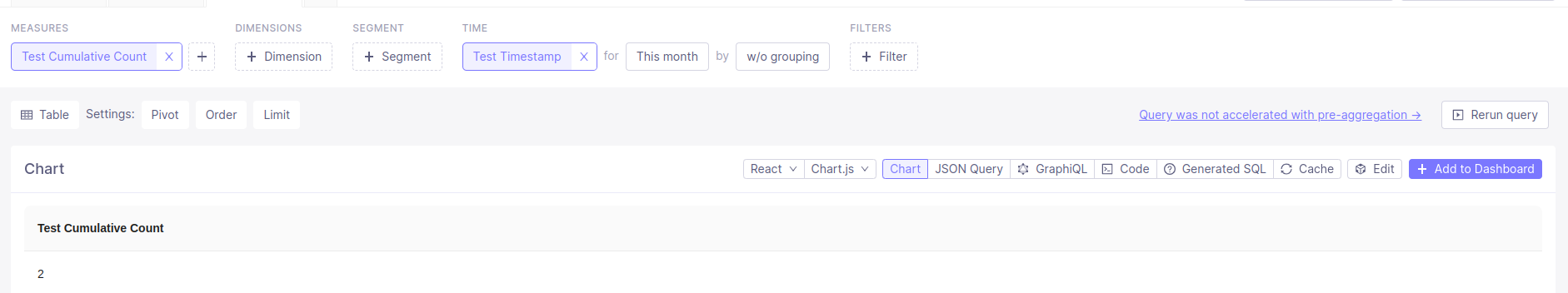 - Go to dashboard, verify that cumulative count works. (without grouping)