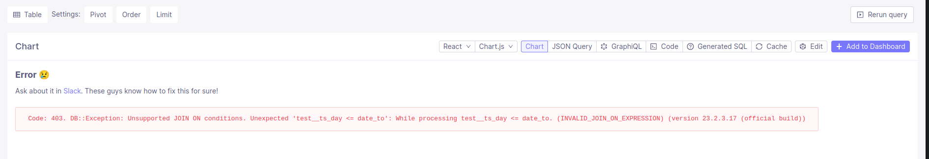 Code: 403. DB::Exception: Unsupported JOIN ON conditions. Unexpected 'test__ts_day <= date_to': While processing test__ts_day <= date_to. (INVALID_JOIN_ON_EXPRESSION) (version 23.2.3.17 (official build))
