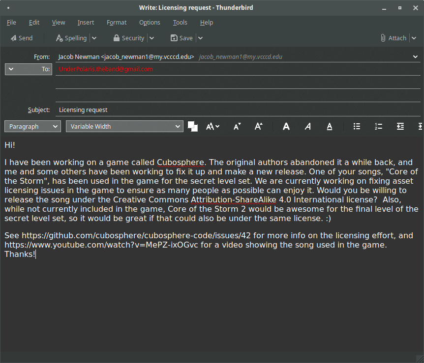 Template: I have been working on a game called Cubosphere. The original authors abandoned it a while back, and me and some others have been working to fix it up and make a new release. One of your songs, , has been used in the game. We are currently working on fixing asset licensing issues in the game to ensure as many people as possible can enjoy it. Would you be willing to release the song under the Creative Commons Attribution-ShareAlike 4.0 International license? See #42 for more info on the licensing effort, and for a video showing the song used in the game. Thanks! |