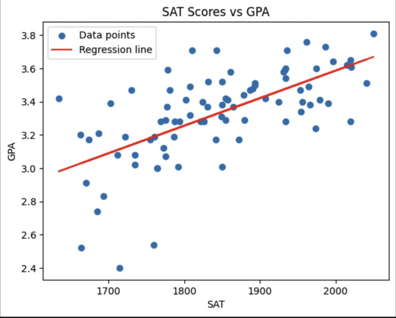 The scatter plot reveals the truth: While many students cluster near the prediction line, substantial outliers exist—students with high SAT scores who struggle, and students with lower scores who excel.