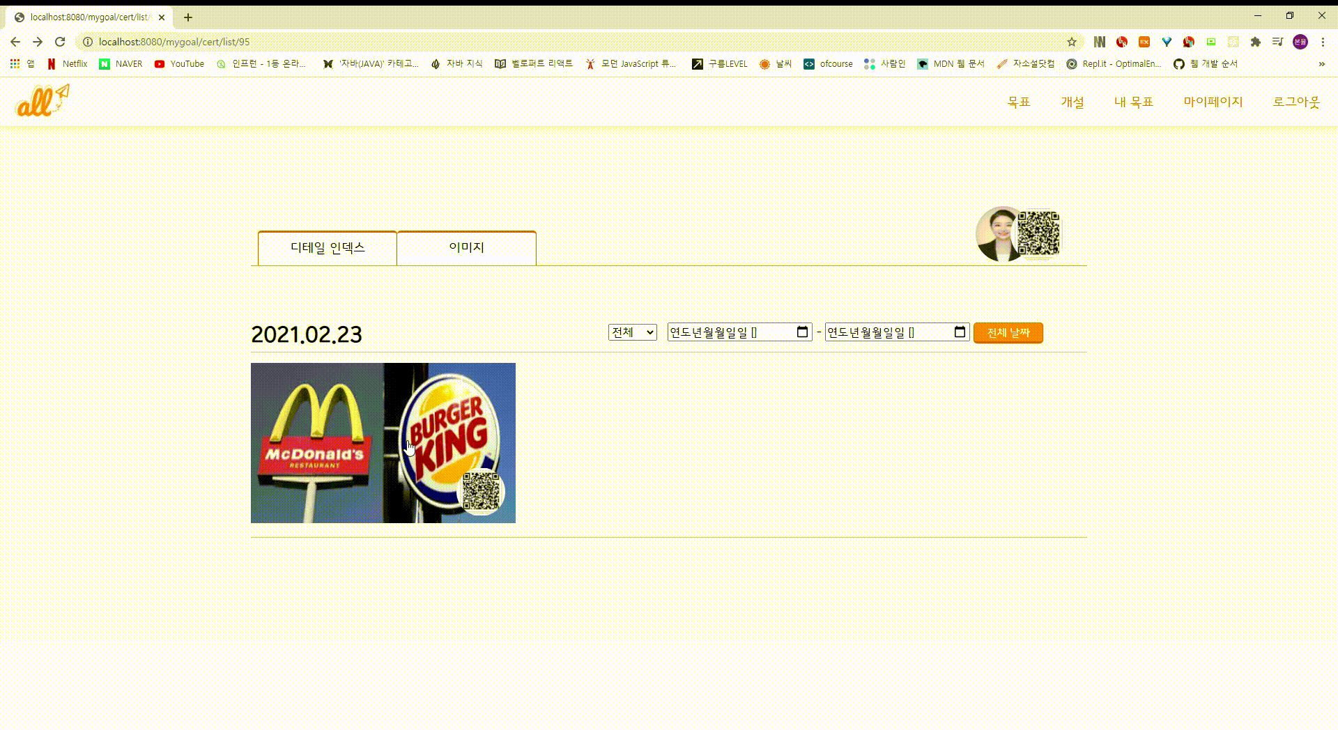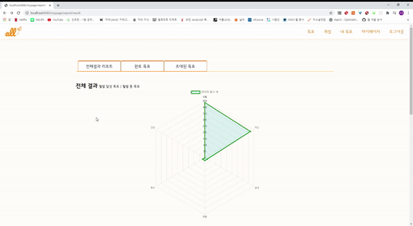 ✅ [10] 완료된 목표 : 목표가 다 끝나면 달성도(80% 기준)에 따라 재도전을 선택할 수 있고 목표 기간동안 인증했던 내용들을 사진으로 볼 수 있으며 각자가 목표 기간동안 올려왔던 사진들을 동영상으로 볼 수 있도록 구현하였습니다. chart.js 를 이용하여 목표 달성도와 평가지 데이터를 기반으로 결과를 요약하여 나타내었습니다.