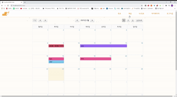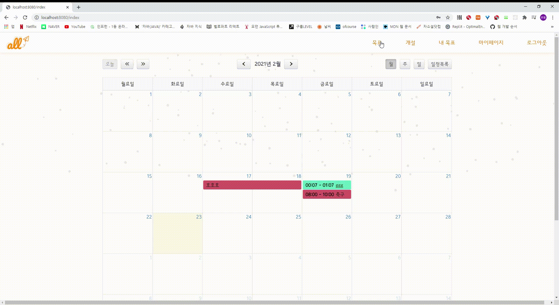 ✅ [5] 인덱스 페이지 : full calendar 라이브러리와 p5.js 라이브러리를 이용해서 달력기능과 눈 효과를 구현해서 구성했습니다.