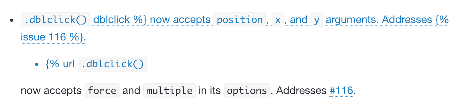 for example <img width="738" alt="Screen Shot 2019-10-23 at 6 03 21 PM" src="https://user-images.githubusercontent.com/2212006/67437700-79a62100-f5bf-11e9-9d21-83b5d7945080.png"> uses invalid markup (see unbalanced `"`) ``` - {% url "`.dblclick()` dblclick %} now accepts `position`, `x`, and `y` arguments. Addresses {% issue 116 %}. ```