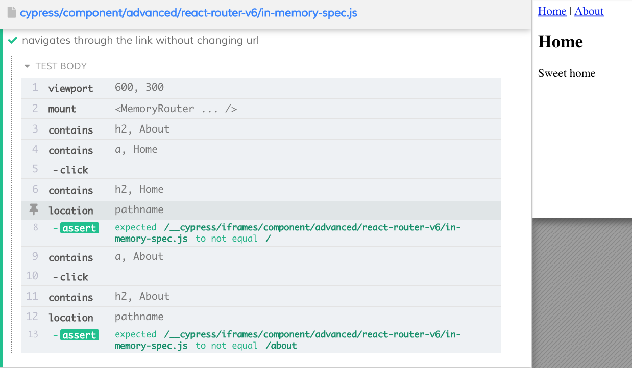 good point, I moved the location assertion after the component text assertion. But other than that - yes, the user should in this case only assert the right component is rendered in the DOM, not the URL. I did URL mostly to confirm that the URL is NOT changing when using memory router