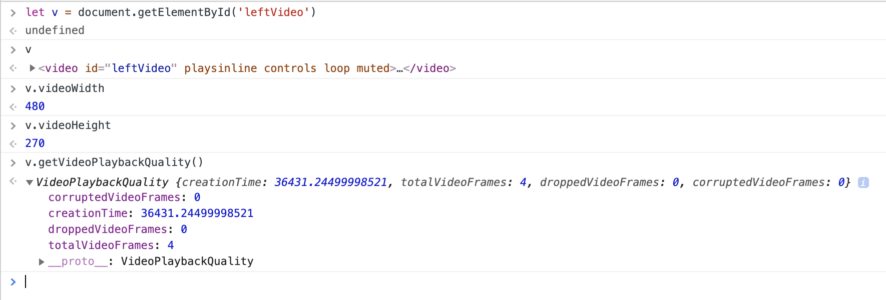 It should return VideoPlaybackQuality object, example in DevTools with the same site