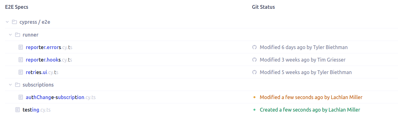 I've done a bit of testing and seems to work great overall. There are two things to look at. First, when creating a spec from Cypress, it doesn't show the git status in the table, see filename.cy.ts here: