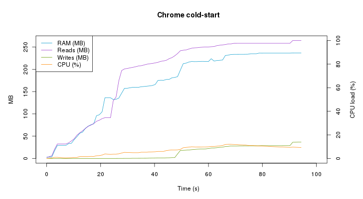 Monitor the first 100 seconds of Google Chrome that from cold-start fires up and load a web site: