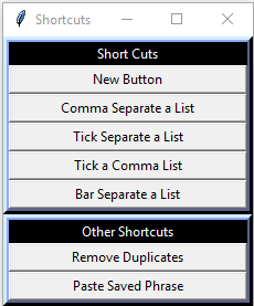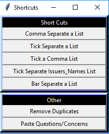 This GUI has some fun features like color options and attributes that keep it on the topmost level at all times. This is very useful when you are clicking back and forth from a SQL windows or Excel sheet. You can easily add or edit functions to create your own version of Python Shortcuts.