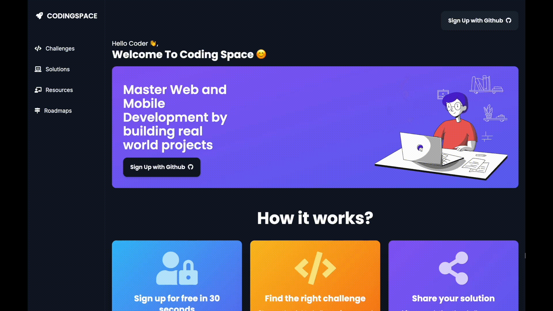 CodingSpace is the platform where we aim to provide lots of different real-world UI-based challenges that can help developers to improve their web and mobile development skills.