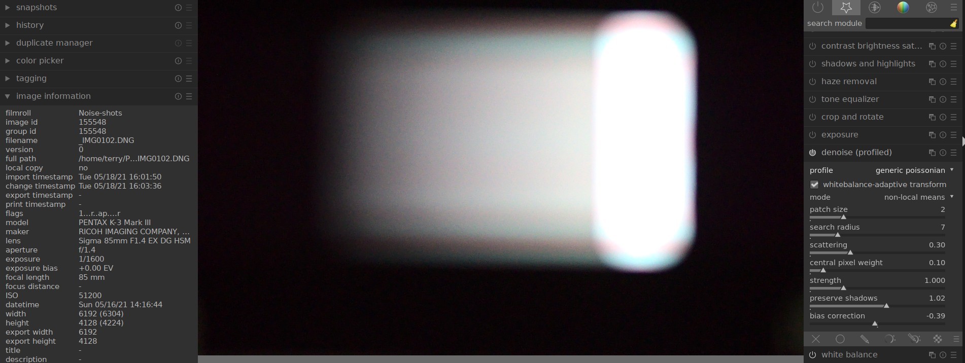 I've generated noise profile data (presets.json file) for the new Pentax K-3 Mark III camera, using the noise tools (darktable-gen-noiseprofile) and attempted to test the noise profiles on images from the camera, starting darktable with the command 'darktable --noiseprofiles /home/terry/Pentax-K-3/presets.json'.