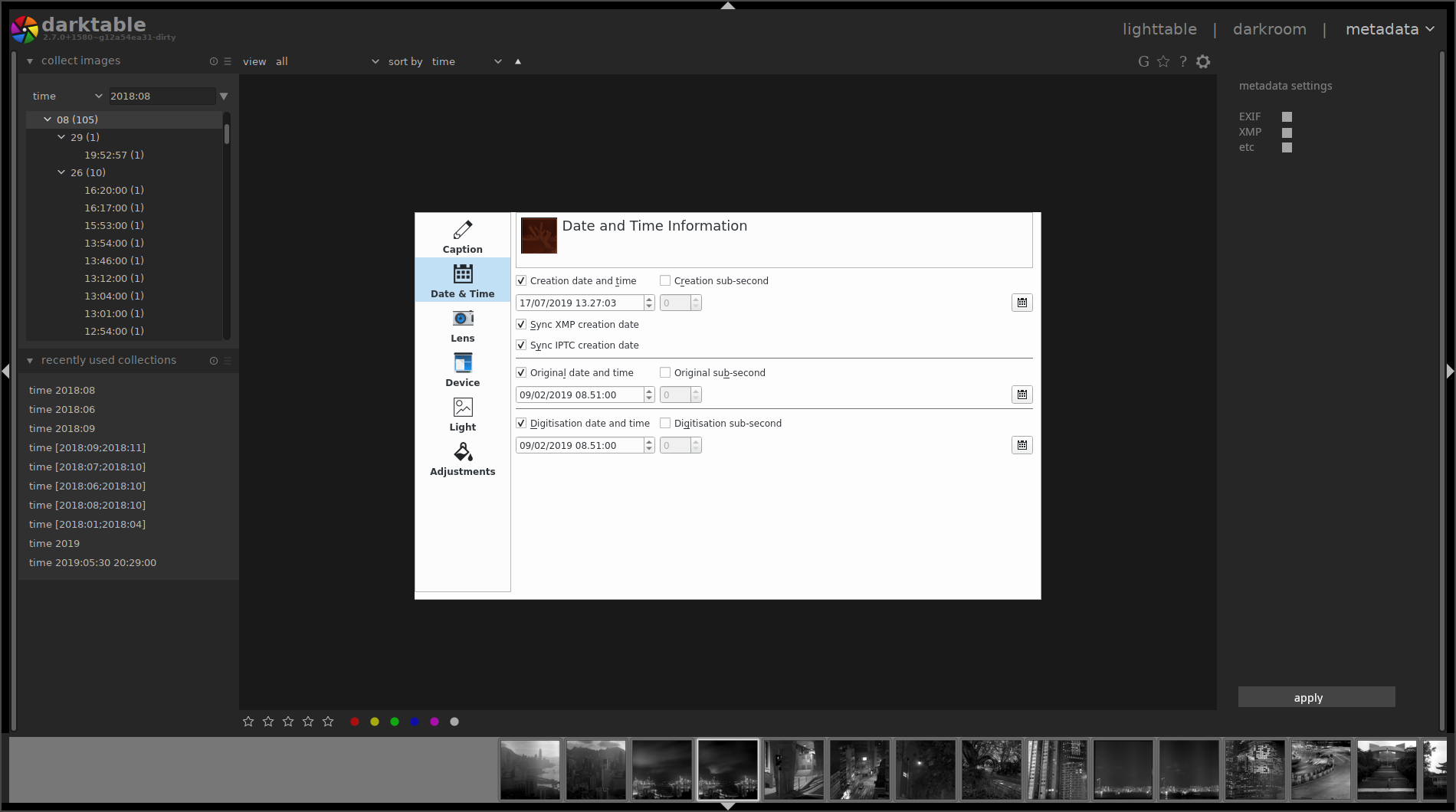 So I made a new mock up, again by taking bits from digiKam but that's just because they have most of the fields already so I thought that would be a lot easier than making all the boxes myself. The basic idea is to have 3 columns with all the different fields and then have the options for which types of metadata to apply them to (with some kind of indicator of what's available for each when ticked). There's a lot of fields from the centre and right hand columns missing because digiKam didn't have them. I'd also like to add something to shift the dates/times by a given a given amount. There is some fields from IPTC especially but also some in XMP like the full contact details, release and expiration dates, and envelope details which could maybe go in another tab or something but I'd be interested to hear from people that actually use those. |
