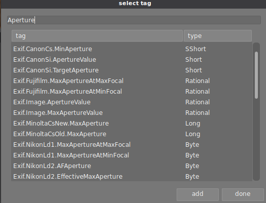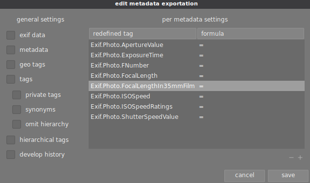 Some variables like $(EXIF_APERTURE) are not suitable to set up the metadata tag Exif.Photo.ApertureValue which is a RATIONAL (two longs) as commented in that thread https://discuss.pixls.us/t/darktable-3-0-exif-on-export/15486. I've worked on the exiv2 metadata types (which are now visible in the metadata tag dictionary) but it seems difficult to convert properly the variables to such metadata. Except other argument I don't plan any work on this. However in the same thread it appears useful to be able to remove all exif tags except some. Here comes the last commit which adds the possibility to enter '=' in the formula. This says that, despite exif tags are disabled, such a tag has to be exported. EDIT: if exif tags are not disabled "=" does nothing. |