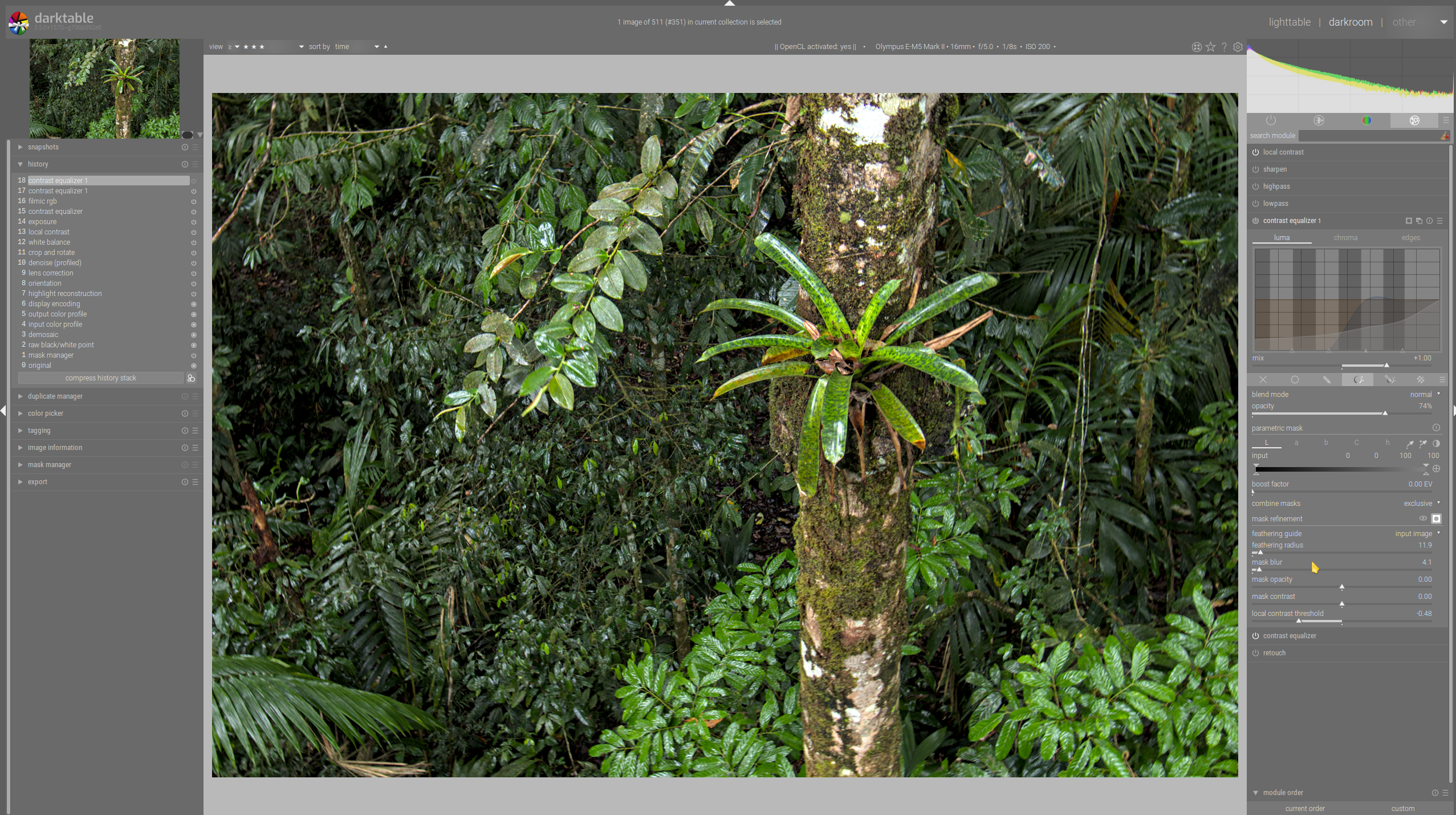 What is this about? For some use cases we want to discriminate image areas with lots of detail from those without. So it is basically not about border or shape detection but something that should be understood as looking for pixelwise local contrast. This idea is used already in darktables dual demosaicing code (to discriminate areas with high frequency content from thos without) and some algorithms in rawtherapee (microcontrast, sharpening, capture sharpening ...) so we know it works really good. The user interface is pretty simple, for every mask offering a refinement box there is an additional slider defining a threshold for the contrast mask. (details later) Positive slider values select for contrasty, negative values for flat regions. What are the use cases of this mask refinement? Right now we can use modules like sharpening, locat contrast, denoising to work only on image areas most suitable. Or we can brighten up some areas with lots of details. In the longer term this will be the basis of yet to be implemented modules we can take from rt, i will certainly port capture sharpening to dt. As @aurelienpierre pointed out in the discussion about darktable-org#8501, the underlying algorithm is a bit more difficult to implement with darktables roi concept as the calculated contrast value is not reliable after scaling, rotation or even simple things as exposure corrections. I tried his suggestions but the original algorithm seems to be better suited for the purpose described. So for calculating the first pixel contrast i kept the "weird thing" So i wanted to find a way keeping "contrast masks" working exactly as in the original implmentations. To get you into faster understanding the code, some details. Whenever we set this slider to a value != 0 the demosaic or rawprepare module are forced to write a *preliminary* contrast mask, this mask has always the size of the roi_out of that module. It is *not* scaled but only clipped so it still contains pure pixel data. This preliminary mask is valid and used for every mask using a "local contrast" refining step. Whenever a mask in any module wants a "local contrast" refinement it a) takes the preliminary mask and calculates a 'mask overlay' using the threshold to calculate a sigmoid value 0->1 for every pixel b) the just calculated mask overlay is now transformed through the pipeline using the modules 'distort' functions, the resulting "warped" contrast mask is now combined with the defined drawn or parametric mask. - opencl code has been impemented - some shared code with rcd and dual demosaicing has been de-duplicated