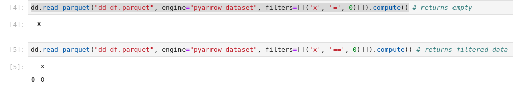dd.read_parquet("dd_df.parquet", engine="pyarrow-dataset", filters=[[('x', '=', 0)]]).compute() # returns filtered data
