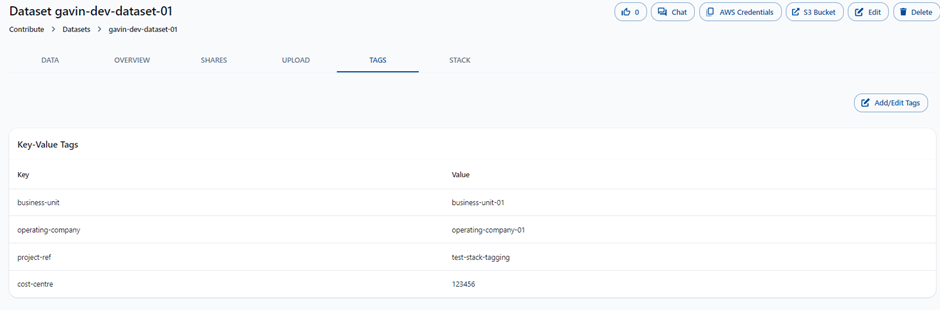 Returning the the data.all UI for the dataset, the newly applied tag is not visible (because it wasn't part of the stack):