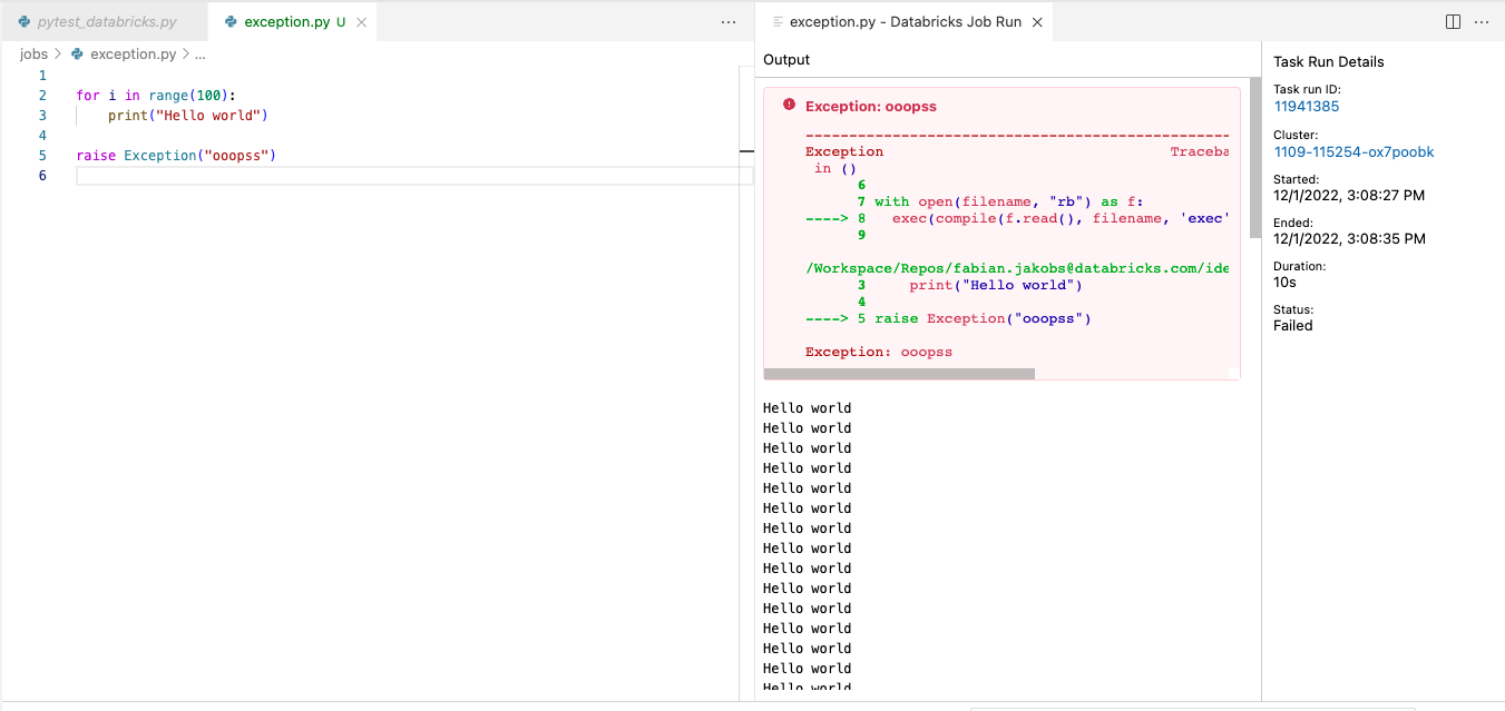 | 406 | + <span style="color:#0AA"> File </span><span style="color:#0A0">"/Workspace/Repos/fabian.jakobs@databricks.com/ide-best-practices/jobs/hello.py"</span><span style="color:#0AA">, line </span><span style="color:#0A0">9</span> |