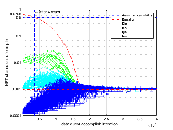A simulation of such NFTs sharing the pie is done with a simplified vector based linear model in MATLAB. The x-axis shows the iterations in the model with a randomly chosen NFT completing a data quest. The number of NFTs in this simulation is 1101 given the limitations of vector sizes and reducing computation time. However, the pie shares given to each category is kept the same as for 10101.