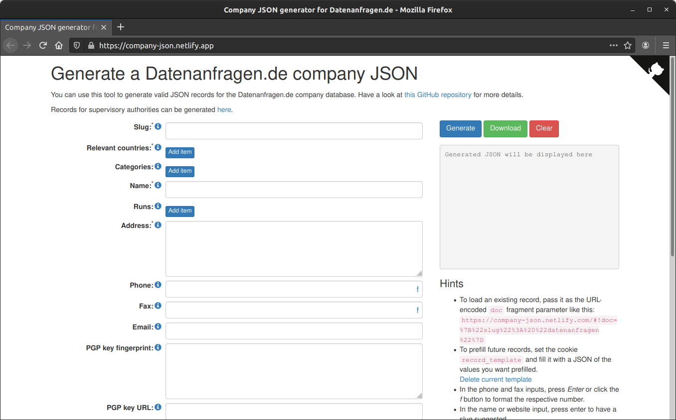 Every company (or other organization) in our database is represented by a single JSON file (named after the slug in the JSON). The JSON has to follow the specific schema. This tool provides you the convenience to generate those JSONs by filling a simple form. The format is explained here.