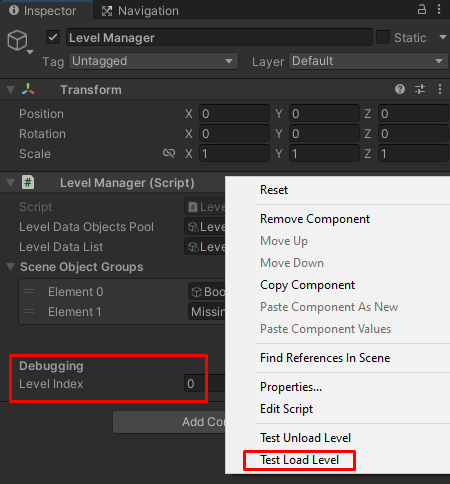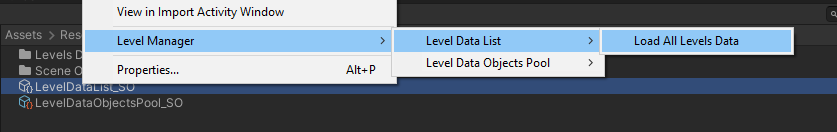The LevelDataObjectsPool_SO will load the scene objects from "Scene Objects" folder on game start, but you can do it manually also --> Right click LevelDataObjectsPool_SO --> Level Manager --> Level Data Objects Pool --> Load All Scene Objects
