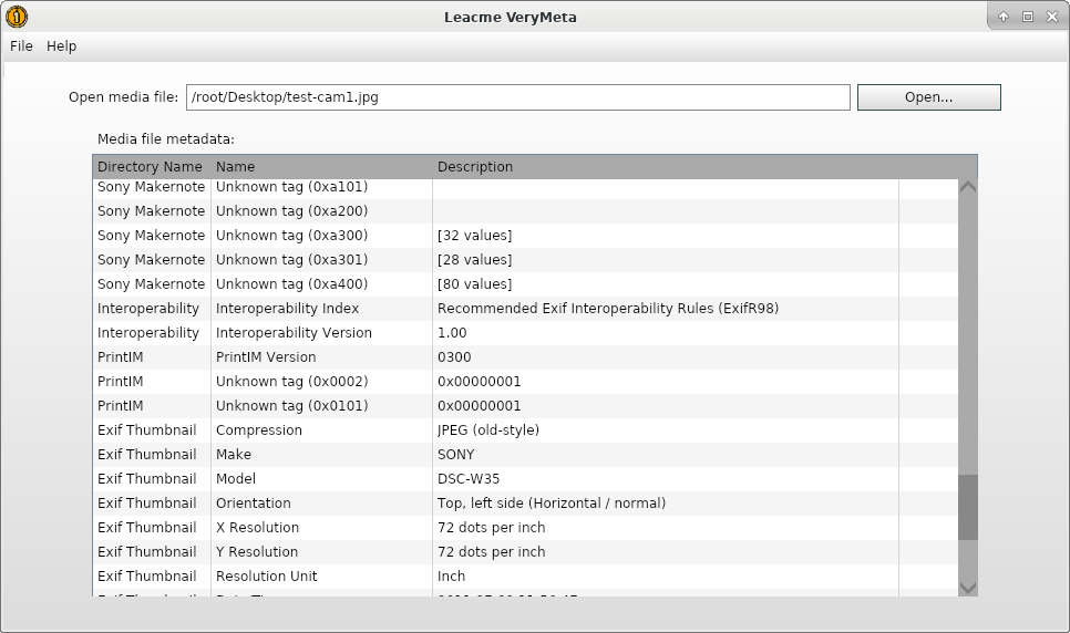 Leacme VeryMeta - This application features the ability to retrieve data such as EXIF, GPS, etc embedded in a media file.