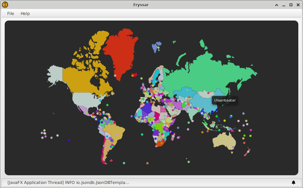 Fryssar - Mouse over a country for name and click it to list its capital. Also mouse over the dots representing the locations of capitals to view their names