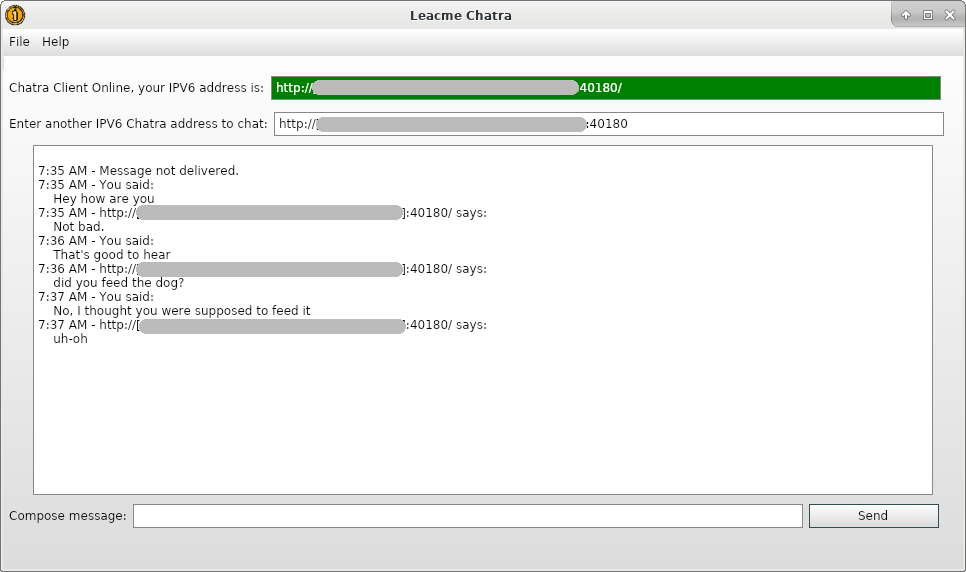 Leacme Chatra - This application features the ability to leverage the unique IPV6 addresses of devices to set up a serverless direct chat session between two devices running this app and exchange messages.