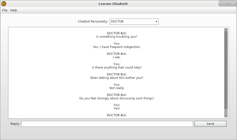 Leacme Elizaboth - This application features the ability to chat with a selected ELIZA-derived bot.