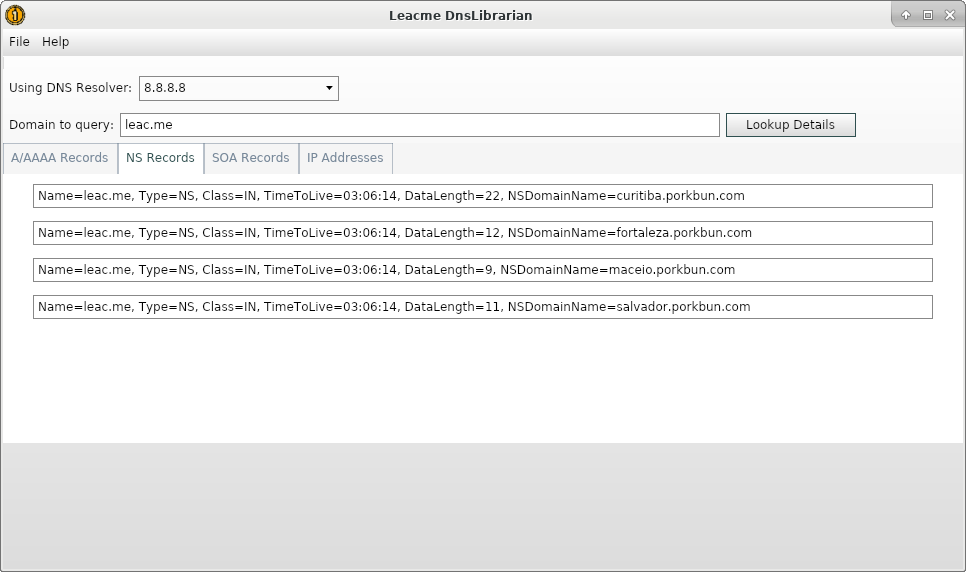 Leacme DnsLibrarian - This application features the ability to retrieve the DNS records of a valid domain ex. "leac.me" such as A/AAAA, MX, NS, TXT, etc.