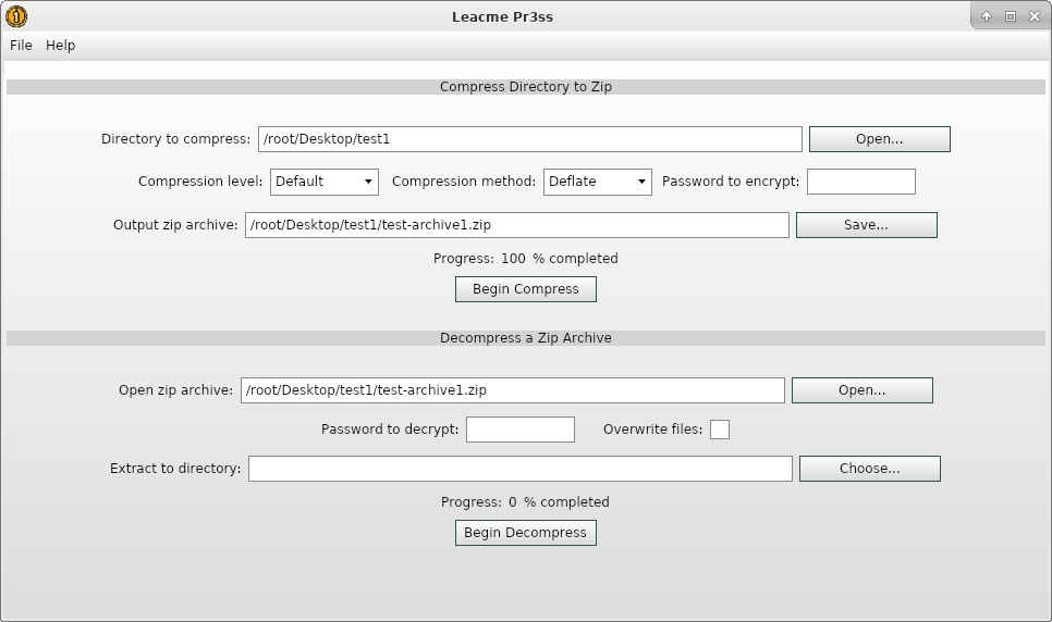 Leacme Pr3ss - This application features the ability to compress a directory of files into a .zip archive as well as extract the archives.