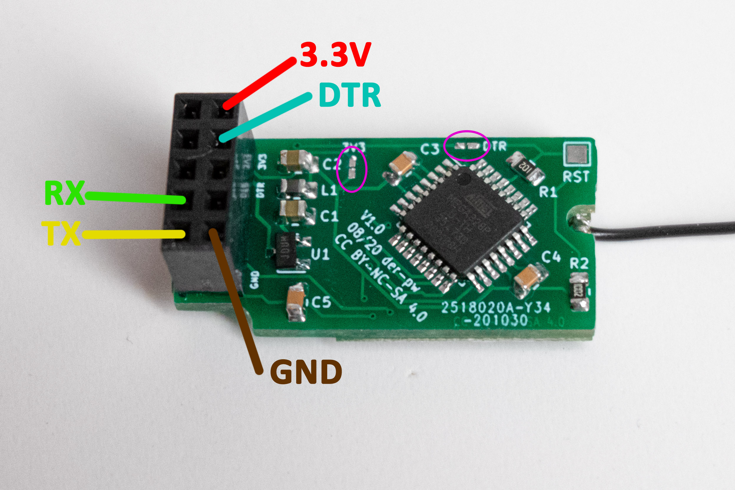 Der 0.1uF in der DTR Strecke ist nicht auf dem PCB vorhanden und sollte ins Verbindungskabel integriert werden. Alternativ kann auch Reset im richtigen Moment kurz gegen GND gebrückt werden.