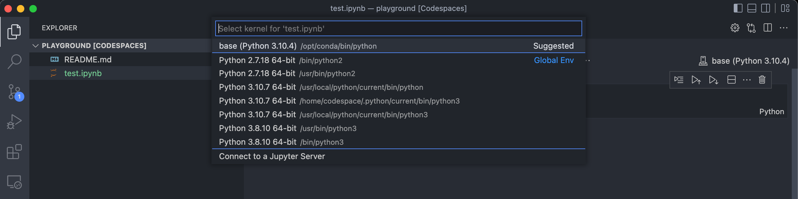 jupyter.kernels.filterVS Code setting to the Universal image to filter unwanted Python kernels. This setting makes for a much cleaner VS Code experience when using the Jupyter extension.This won't filter new Conda environments or Python installations that users add. It just hides the extra installations in the universal image that don't include our Jupyter and ML tooling.