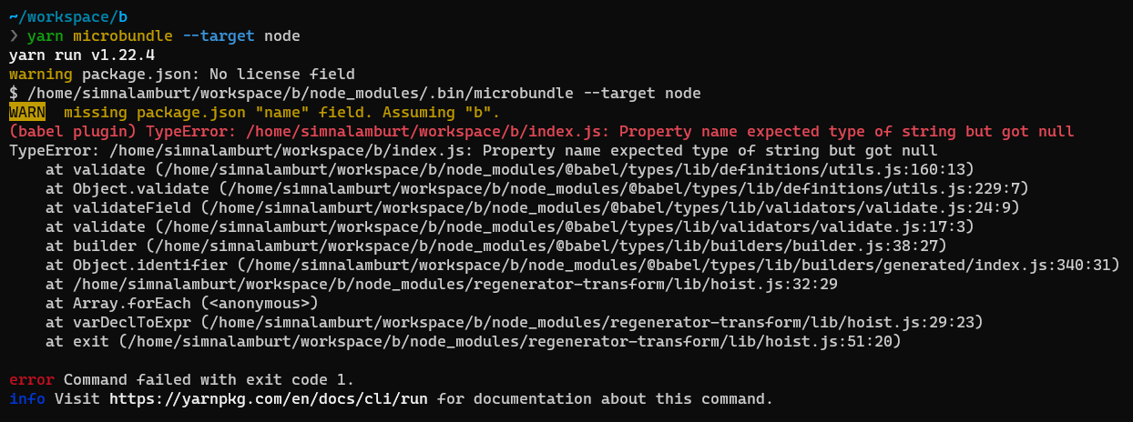 TypeError: /home/simnalamburt/workspace/b/index.js: Property name expected type of string but got null