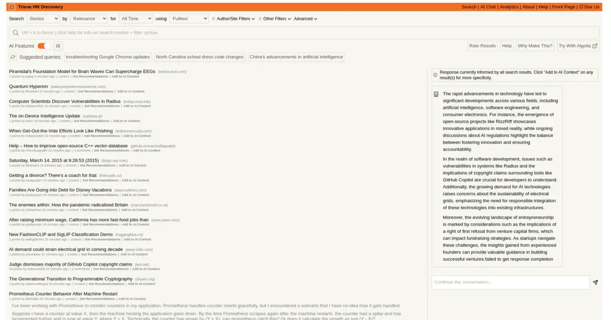 Dense vector semantic search, re-rankers, SPLADE, and other techniques have gotten a lot of hype recently, but it's hard to figure out where each technique is best applied. We're hackers and built hacker'y features into Trieve to make it easier to test and experiment with this new tech, and needed a dataset us and our friends would have knowledge of to mess with. We're hoping to build lots of cool shareable projects on top of this demo to learn and collect feedback with.