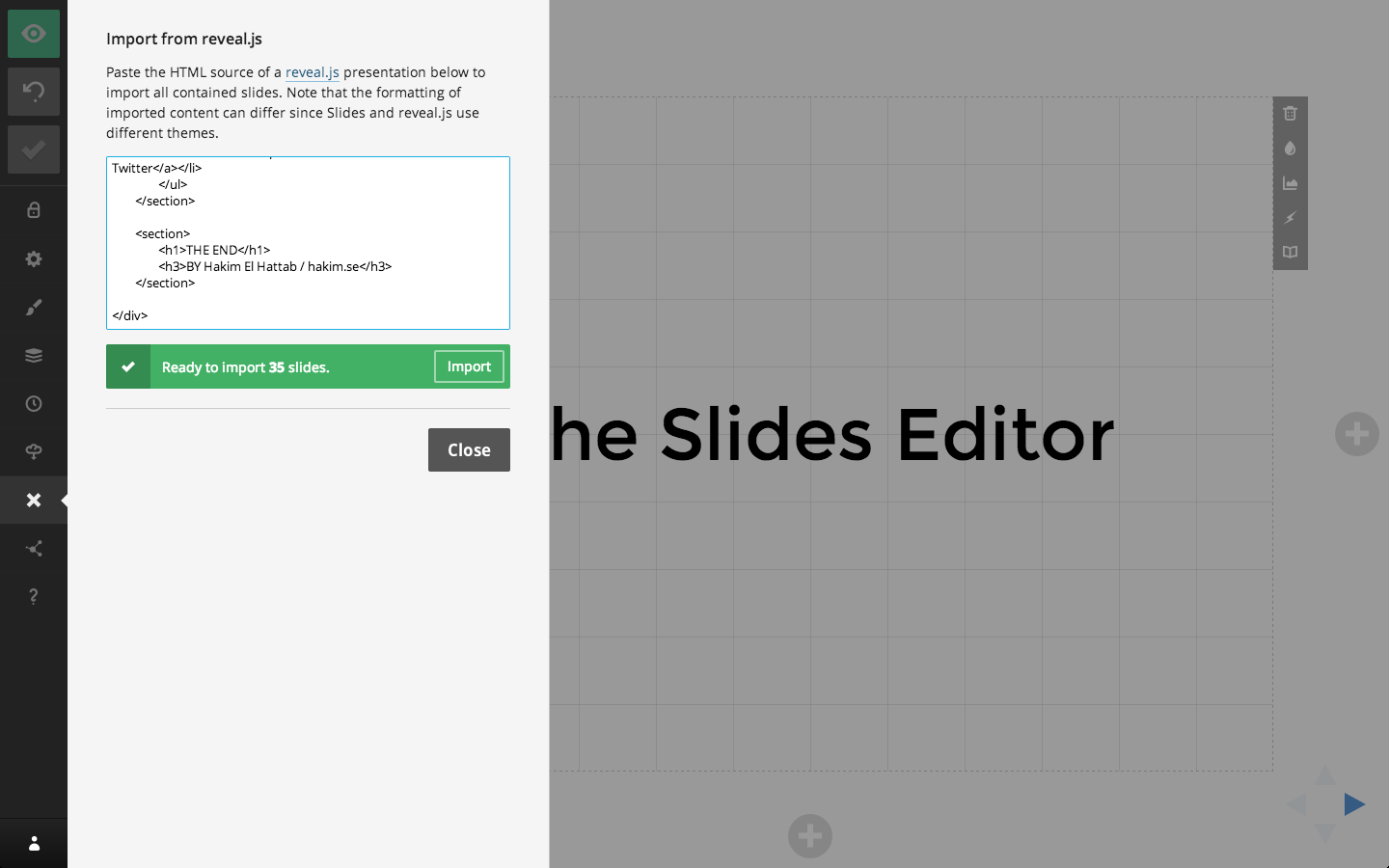 import - To import simply paste the HTML source of your presentation into the input field. We'll inspect the markup and let you know how many slides we were able to find.