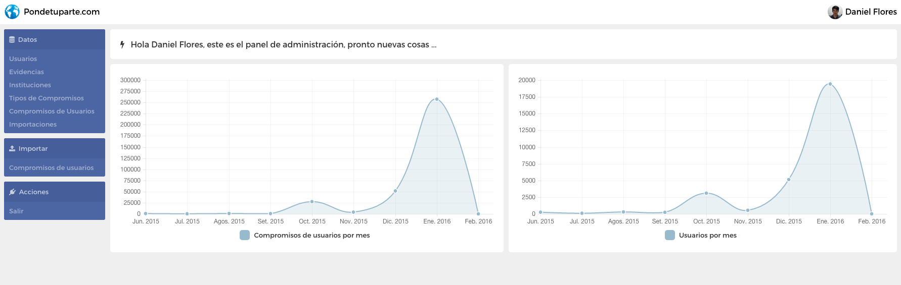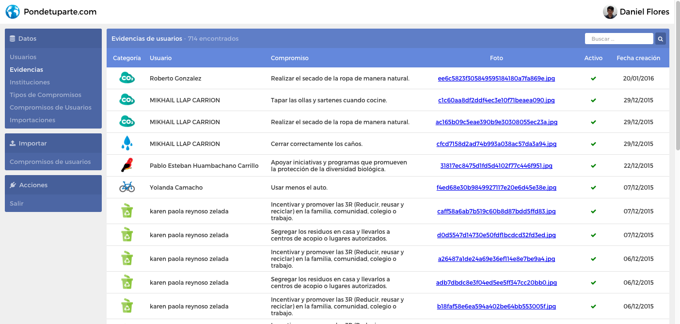 The Pondetuparte.com administration page, where the administrator user could list the users, commitments, types of commitments and many other entities related to the Pondetuparte.com system. Original theme created by me.