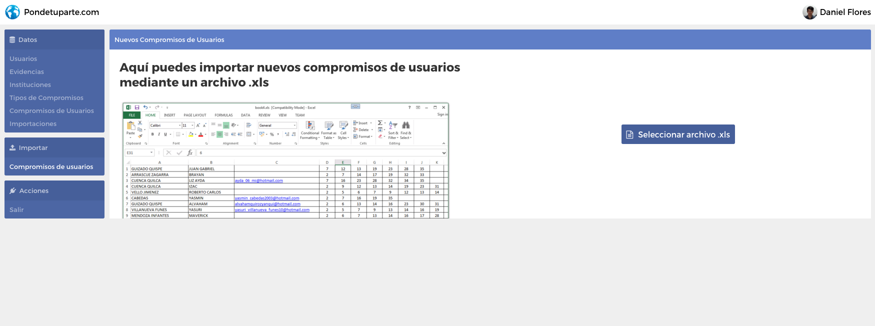There is also a function to import commitments collected in XLS files to the Pondetuparte.com database.