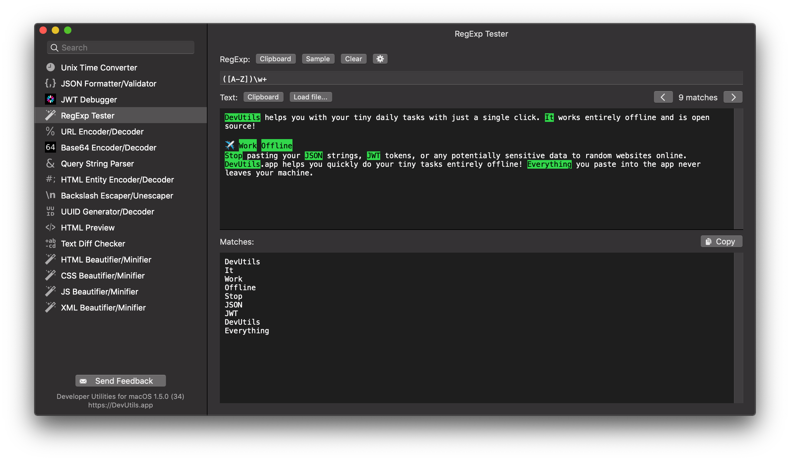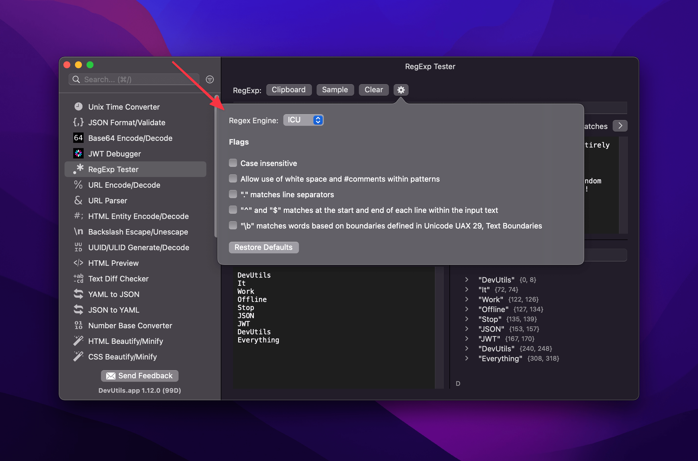 Test your regular expressions without online tools. DevUtils.app allows you to quickly test regular expressions with a sample text without any internet connection. It supports ICU regex engine and flags: case sensitive, white space, comments, line separator options...