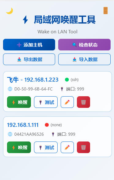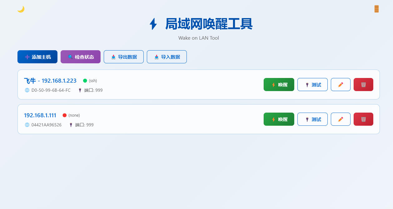 一个简单易用的局域网唤醒工具,支持通过Web界面管理主机、发送WOL唤醒包、检测服务器状态以及测试端口连通性。