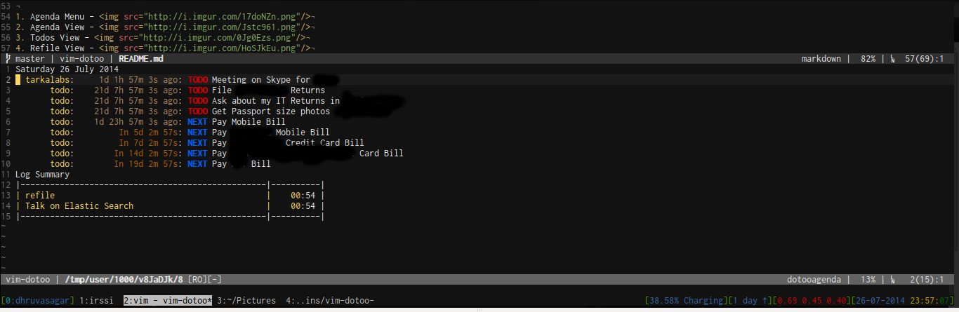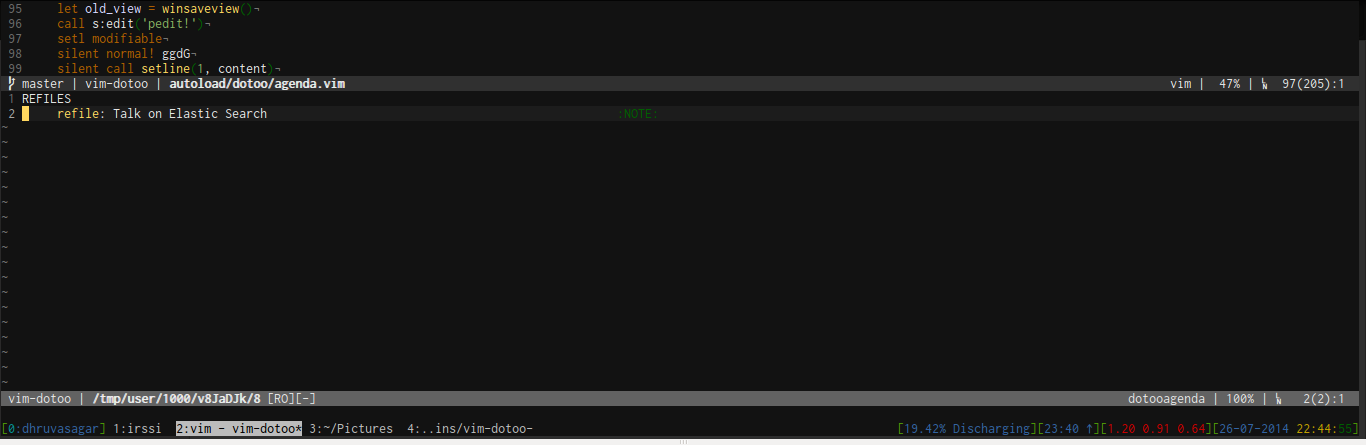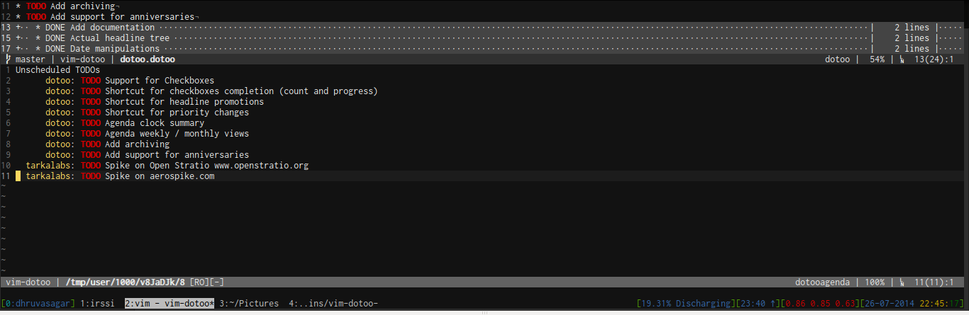 Agenda View : This displays all TODOs that are nearing deadline. It provides a variety of mappings to manipulate the TODO items from the agenda view itself.