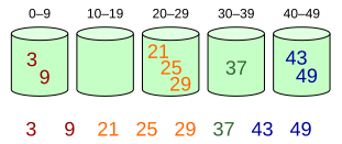 Bucket sort, or bin sort, is a sorting algorithm that works by distributing the elements of an array into a number of buckets. Each bucket is then sorted individually, either using a different sorting algorithm, or by recursively applying the bucket sorting algorithm.