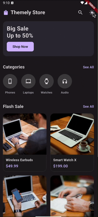 themely: ^1.0.0To get started with Themely, you need to configure your ThemeController and wrap your app with ThemelyApp. Themely handles the ThemeData injection automatically via AnimatedTheme for smooth transitions.